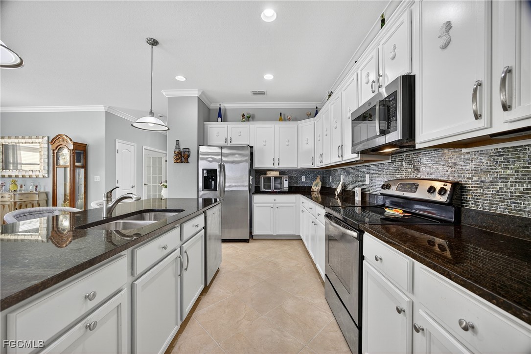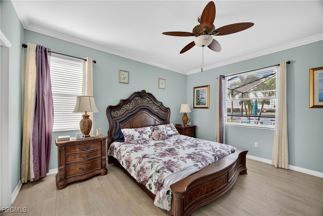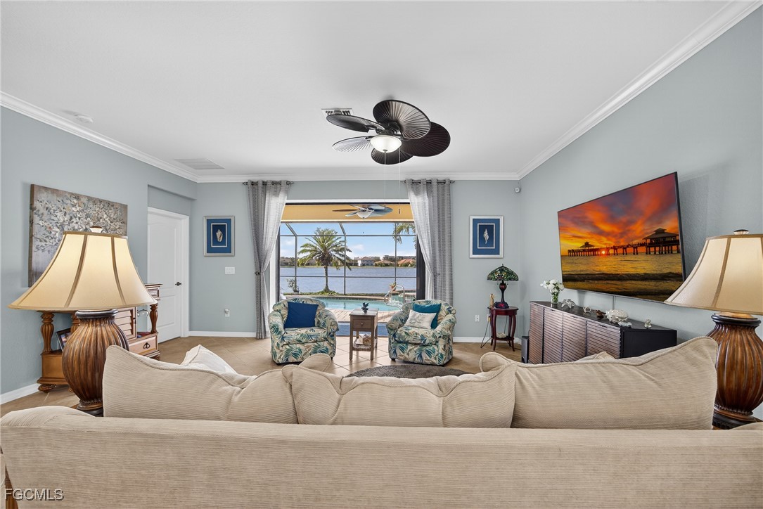 PROMENADE WEST! MOVE-IN-READY! SOUTHWEST FACING VIEWS TO ENJOY GORGEOUS SUNSETS OVER THE LAKE! Impeccably maintained 4 bedroom, 3 bath, 2-car garage lakefront pool home in the gated community of The Forum! Private screened front entry leads into contemporary open floor plan featuring high ceilings, crown molding, neutral décor, custom coastal murals, tile and laminate flooring and large pocket slider to lanai and pool. Beautiful kitchen offers light cabinetry, granite counters, stylish backsplash, stainless appliances and center island with breakfast bar for casual dining. Generous primary suite offers water views, his and her walk-in closets and ensuite bath with dual sinks, garden bath and walk-in shower. Second bedroom features full private bath plus two additional guest bedrooms with separate full bath. Fourth bedroom is perfect for a great den or office space. Fabulous outdoor entertaining area features covered lanai, screened heated pool and spa, paver decking and serene lake views. Exterior is surrounded by lush landscaping enhancing the great curb appeal of this home. Additional special features include inside laundry room, in-wall pest system, irrigation system, hurricane shutters and tile roof. Great location minutes from I-75 to commute north or south, restaurants, shopping, schools, golf and all amenities the area has to offer. Don’t miss this opportunity to make this charming lakefront home your new Florida retreat or permanent residence. Schedule your private showing today!