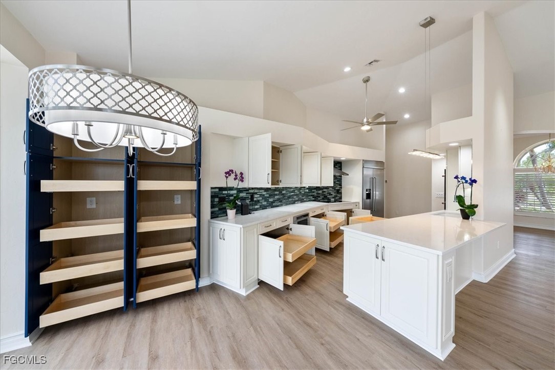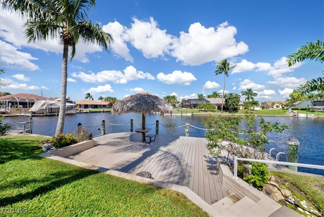 Experience the pinnacle of coastal luxury at 1227 SW 51st Street Cape Coral, Florida, a captivating 3-bedroom, 2.5-bath (pool bath) residence offering direct sailboat access to the Gulf of Mexico and beyond. Perfectly positioned on an oversized 10,846 sq. ft. lot along the 127-ft-wide Finn Canal, this waterfront masterpiece features 164 ft. of pristine canal frontage, two composite docks with water & electric, a 40-ft. canopy (2023), and a 20,000-lb Golden Boat Lift—ready for your yacht or sailboat.From your backyard, set sail to Sanibel, Captiva, Fort Myers Beach, Cayo Costa, Pine Island, Boca Grande, Useppa, Key West, and beyond. Enjoy peaceful moments of pristine boat and kayak watching as the waterway comes to life around you. Inside, elegance meets comfort with a $100K+ designer kitchen remodel (2023) featuring Quartz countertops, KitchenAid appliances, soft-close wood cabinetry, pull-out drawers, and double ovens—a chef’s and entertainer’s delight. The open-concept layout is enhanced by plantation shutters, electric blinds, and expansive water views from nearly every room. Notable upgrades include Daikin 4-ton AC (2022), new roof (2021), water heater (2023), saltwater pool, interior paint (2025), and a custom owner’s closet (2025). Additional features such as electric hurricane shutters for the kitchen windows and a hurricane crank for the front door. The impeccable craftsmanship throughout offers peace of mind and style in equal measure. Outdoors, a travertine-tiled lanai surrounds the sparkling saltwater pool and spa, overlooking wide intersecting-canal views—the perfect setting for world-class sunrises and unforgettable sunsets. Unwind beneath your private tiki, toast to the golden sky, and feel the serenity that defines true waterfront living. Every detail of this home reflects refinement, tranquility, and adventure—a rare opportunity to live the Southwest Florida boating lifestyle at its most luxurious. This one won't last long! The boat is available outside of the sale of the home.
