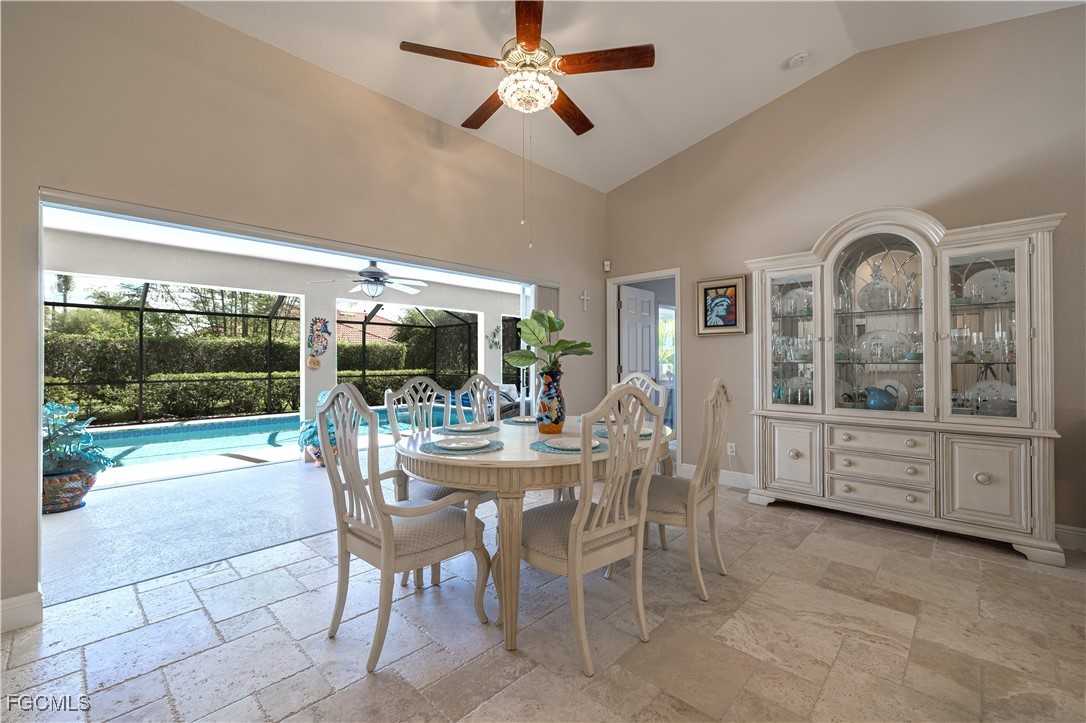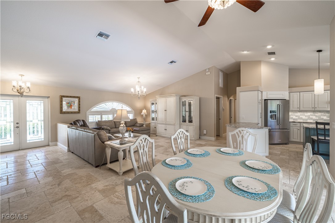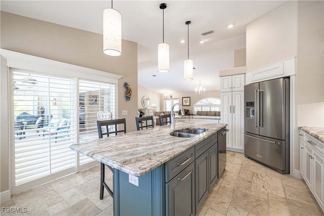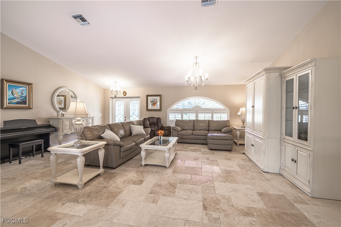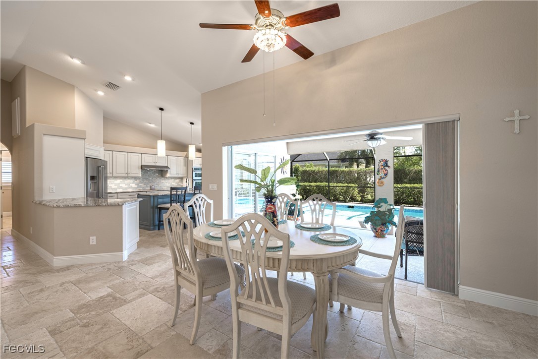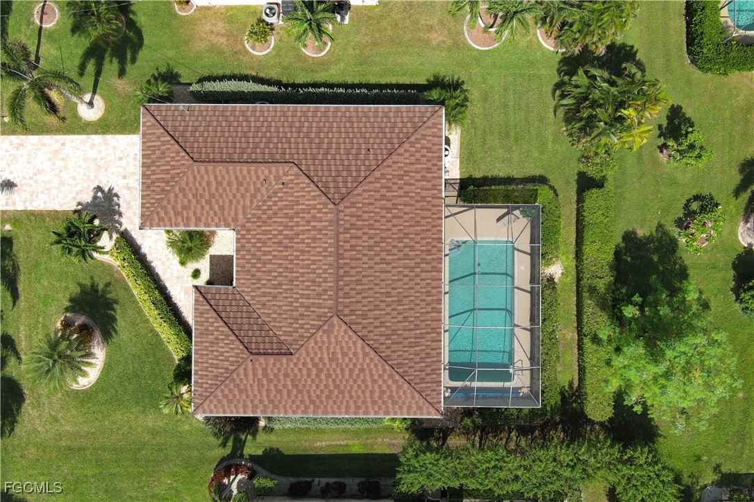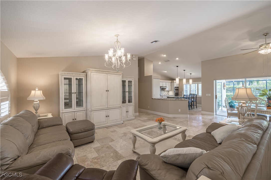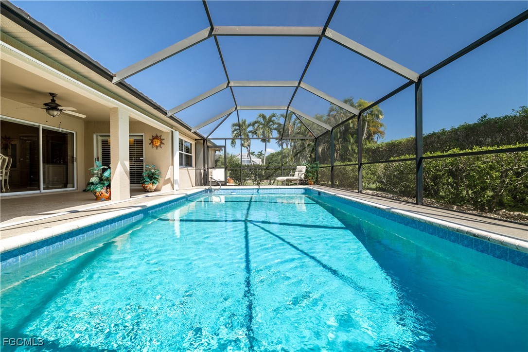Situated on a royal palm–lined street across from Gulf access homes, this beautifully upgraded SW Cape Coral heated pool residence delivers exceptional curb appeal and peace of mind. An expansive paver driveway and walkway lead to a grand double-door entry surrounded by lush tropical landscaping. A 2023 installed stone-coated steel roof and full hurricane protection provide long-term durability, energy efficiency, and some of the lowest insurance rates available. Outback, enjoy a the large covered lanai that overlooks a heated 30’ x 14’ pool, ideal for year-round enjoyment and entertaining. Make your way inside through one of three sets of sliders (2 sets of pocket slider) where you'll find tremendous upgrades throughout the nearly 2,000 SF with 3 Beds, 2 Baths, and a wide-open great room concept. The remodeled kitchen is a true showpiece, featuring a large eat-in island, stainless KitchenAid appliances, 36" induction cooktop with range hood, and a wall oven. Travertine floors flow through the main living areas with tile throughout the rest of the home for easy maintenance. The spacious master suite offers direct pool access and a completely reimagined spa-style bath, with finishes typically reserved for higher price points. The little touches like the newly painted interior and exterior, plantation shutters, a "must be seen to be appreciated" epoxied garage w/mini-split AC, and a PEX plumbing system add the perfect finishing touches on a beautiful home. Better yet, all city utilities are installed and all assessments are paid! Just a hop, skip, and a jump away is the new Sands Park, offering tennis, pickleball, basketball, walking trails, playground, bocce, cornhole, putting green and more—adding unmatched recreational amenities right in your neighborhood.