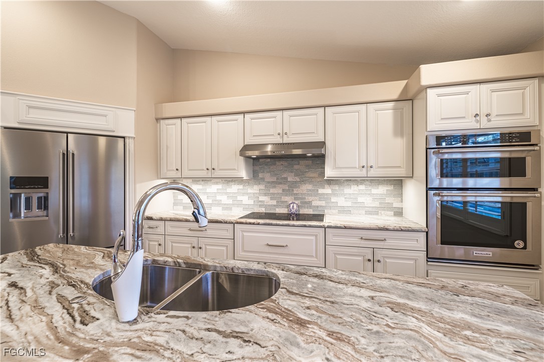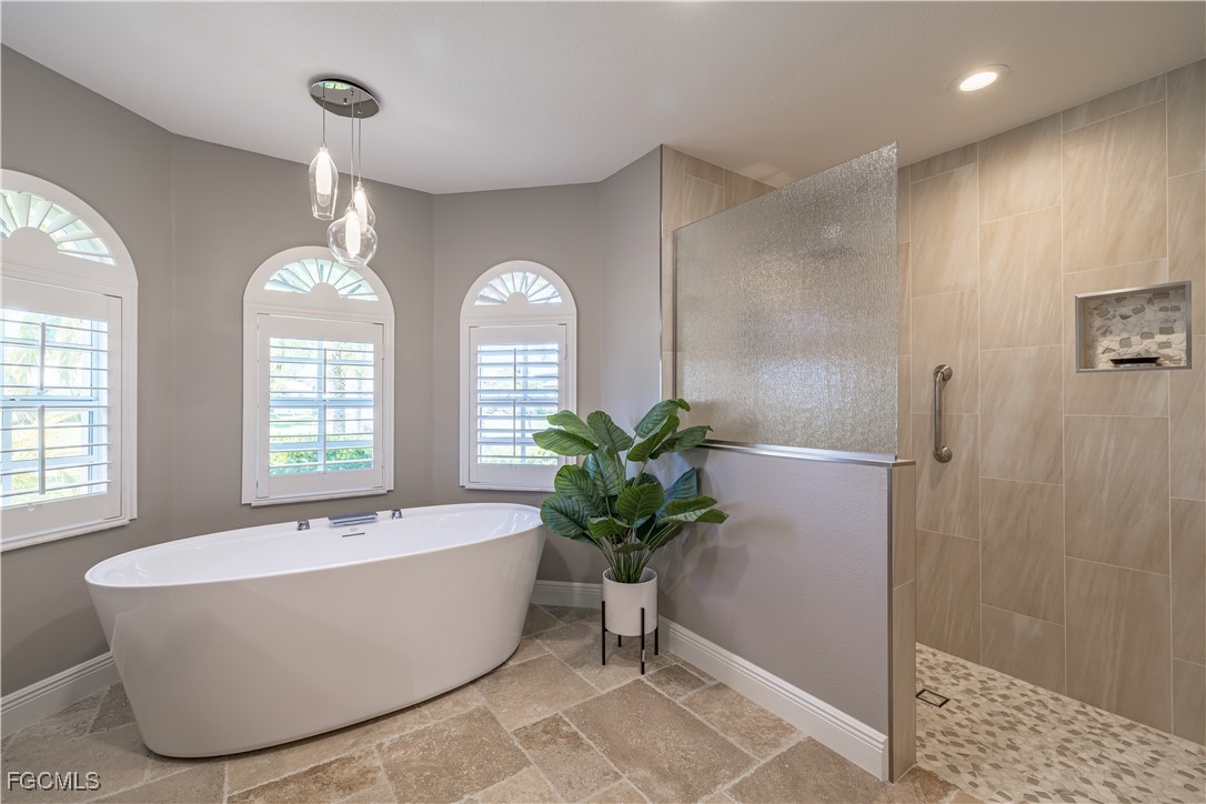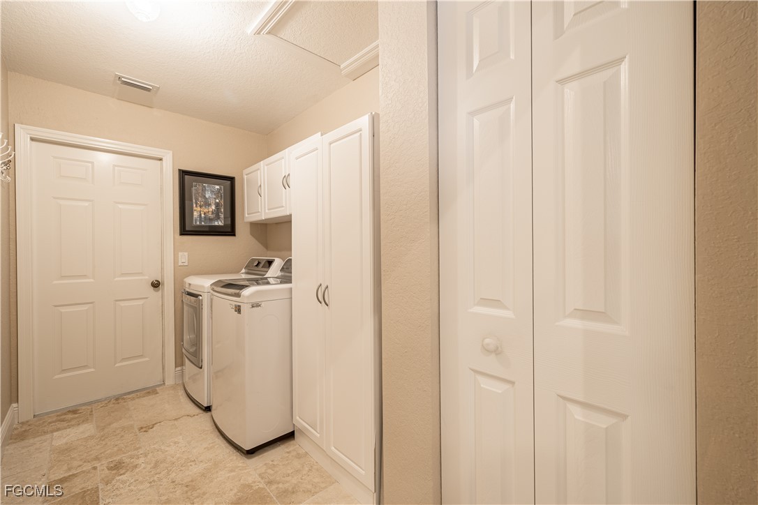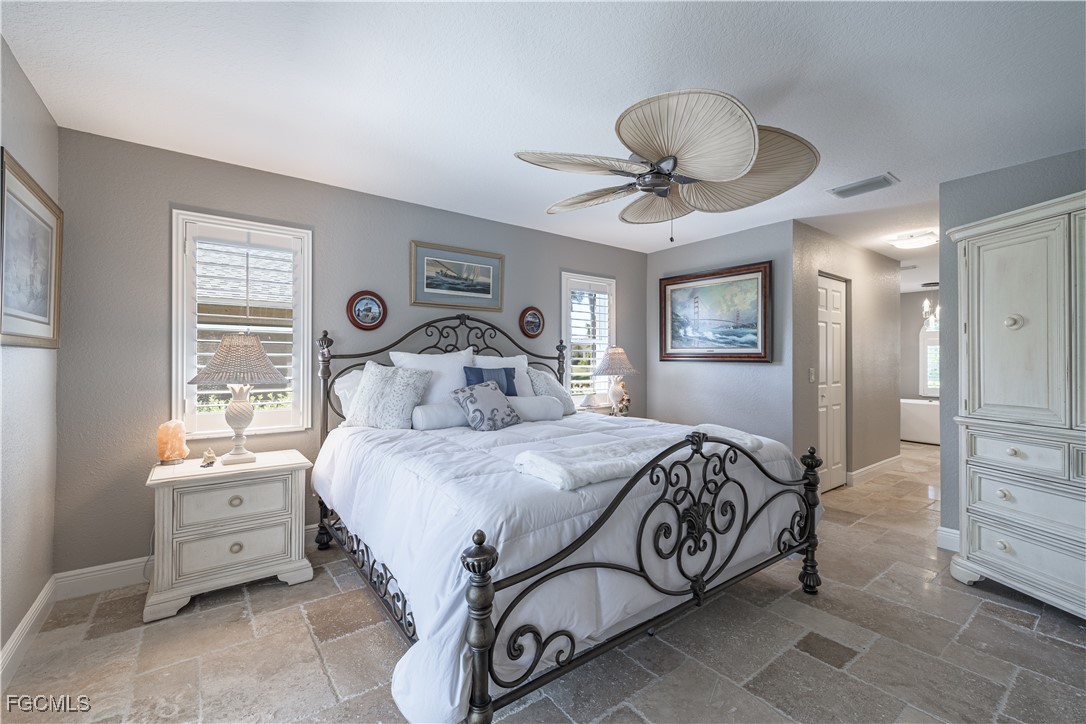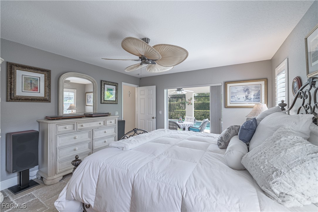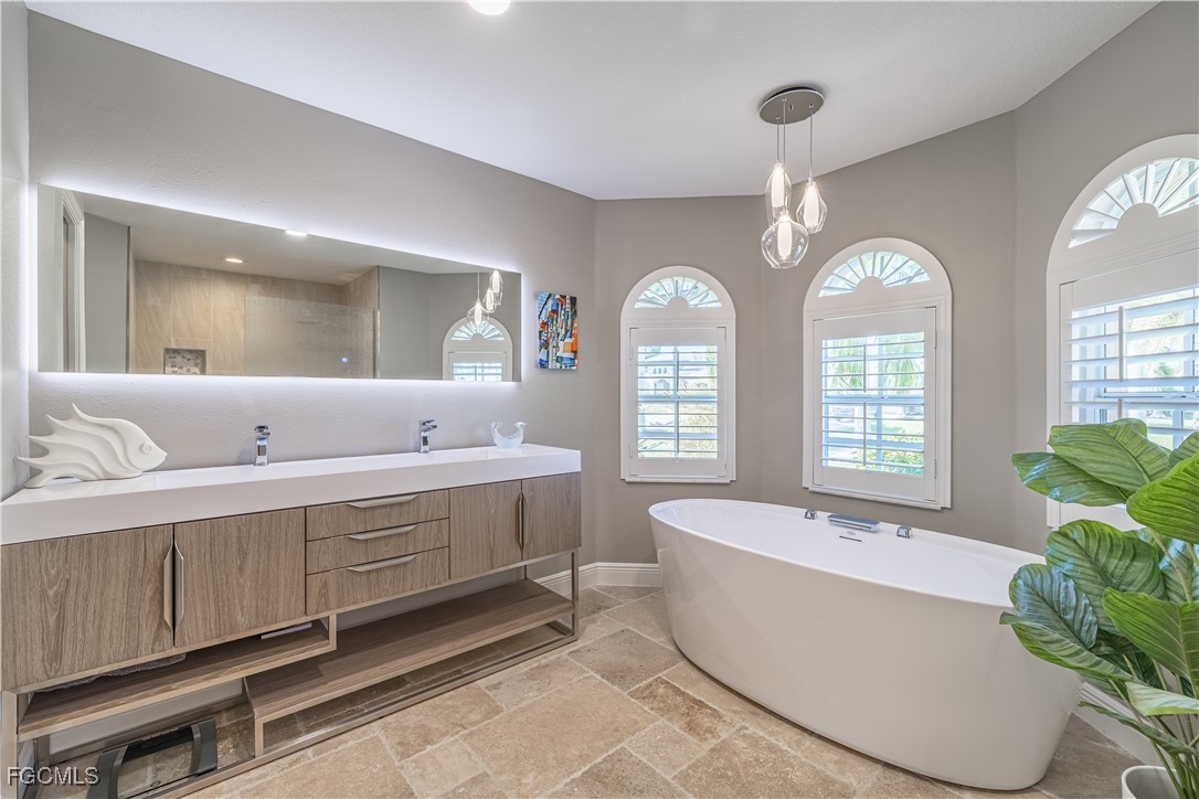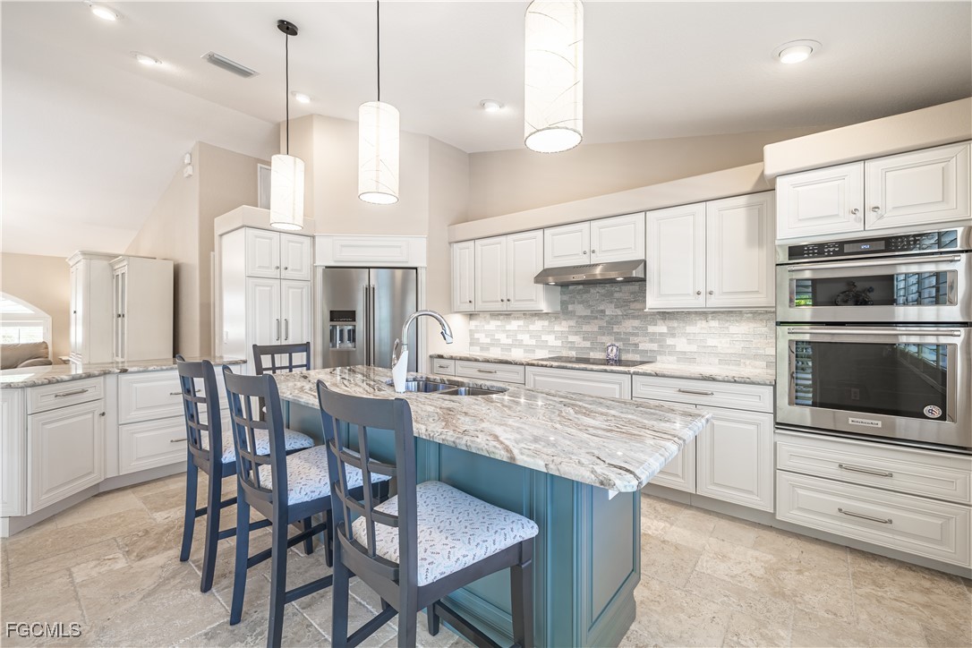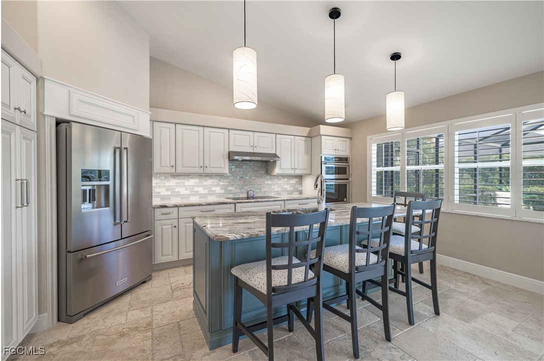Situated on a royal palm–lined street across from Gulf access homes, this beautifully upgraded SW Cape Coral heated pool residence delivers exceptional curb appeal and peace of mind. An expansive paver driveway and walkway lead to a grand double-door entry surrounded by lush tropical landscaping. A 2023 installed stone-coated steel roof and full hurricane protection provide long-term durability, energy efficiency, and some of the lowest insurance rates available. Outback, enjoy a the large covered lanai that overlooks a heated 30’ x 14’ pool, ideal for year-round enjoyment and entertaining. Make your way inside through one of three sets of sliders (2 sets of pocket slider) where you'll find tremendous upgrades throughout the nearly 2,000 SF with 3 Beds, 2 Baths, and a wide-open great room concept. The remodeled kitchen is a true showpiece, featuring a large eat-in island, stainless KitchenAid appliances, 36" induction cooktop with range hood, and a wall oven. Travertine floors flow through the main living areas with tile throughout the rest of the home for easy maintenance. The spacious master suite offers direct pool access and a completely reimagined spa-style bath, with finishes typically reserved for higher price points. The little touches like the newly painted interior and exterior, plantation shutters, a "must be seen to be appreciated" epoxied garage w/mini-split AC, and a PEX plumbing system add the perfect finishing touches on a beautiful home. Better yet, all city utilities are installed and all assessments are paid! Just a hop, skip, and a jump away is the new Sands Park, offering tennis, pickleball, basketball, walking trails, playground, bocce, cornhole, putting green and more—adding unmatched recreational amenities right in your neighborhood.
