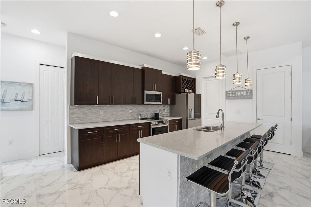 The kitchen features Corian countertops and a breakfast bar that opens to the main living area, making it perfect for entertaining. Step outside to your private backyard oasis with a saltwater pool and a fully equipped outdoor kitchen, ideal for relaxing or hosting gatherings.