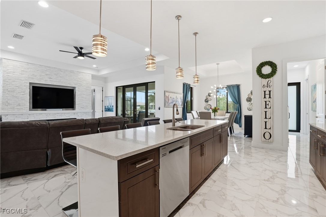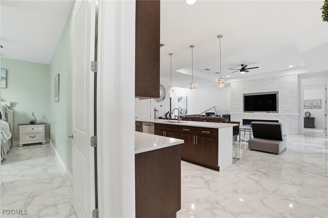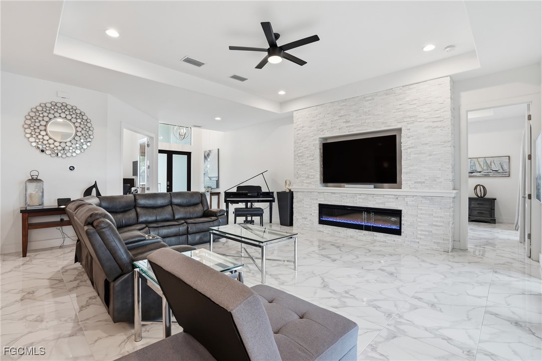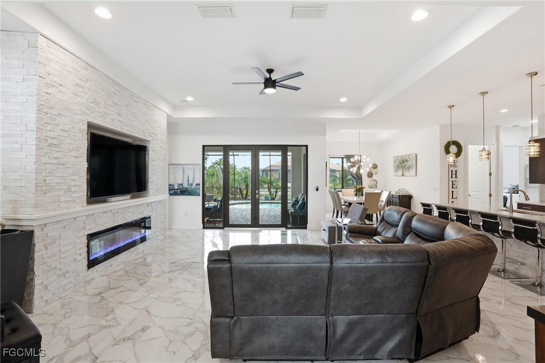 Step inside to find oversized porcelain tile throughout, tray ceilings, and a custom stone fireplace that adds warmth and character to the living space.
