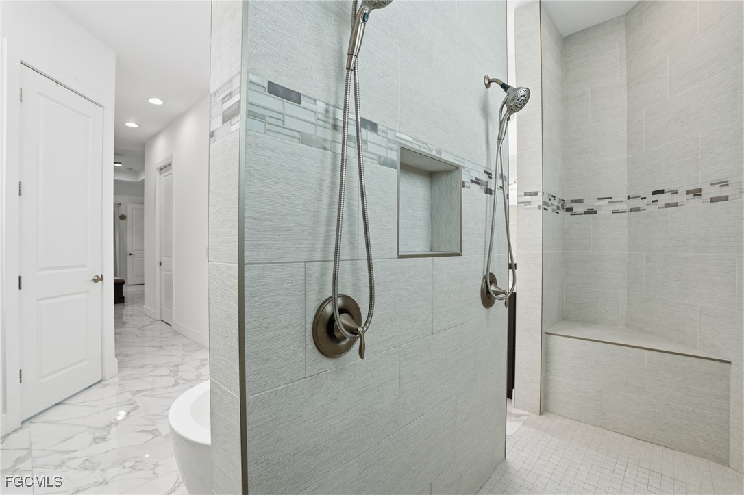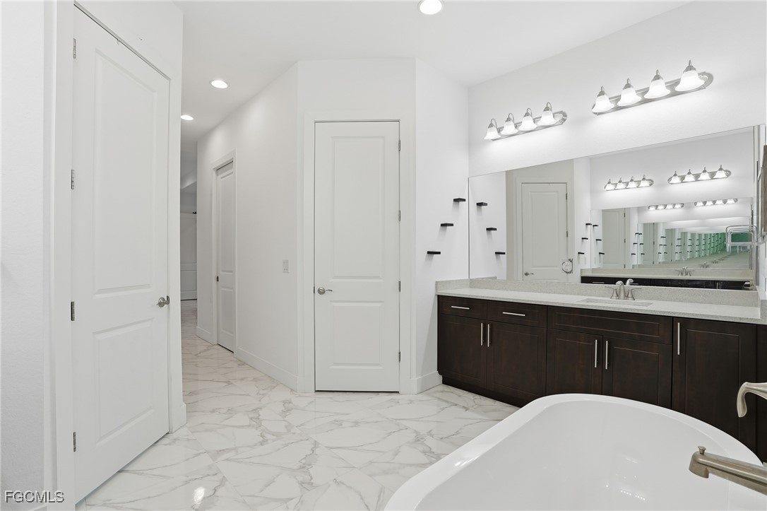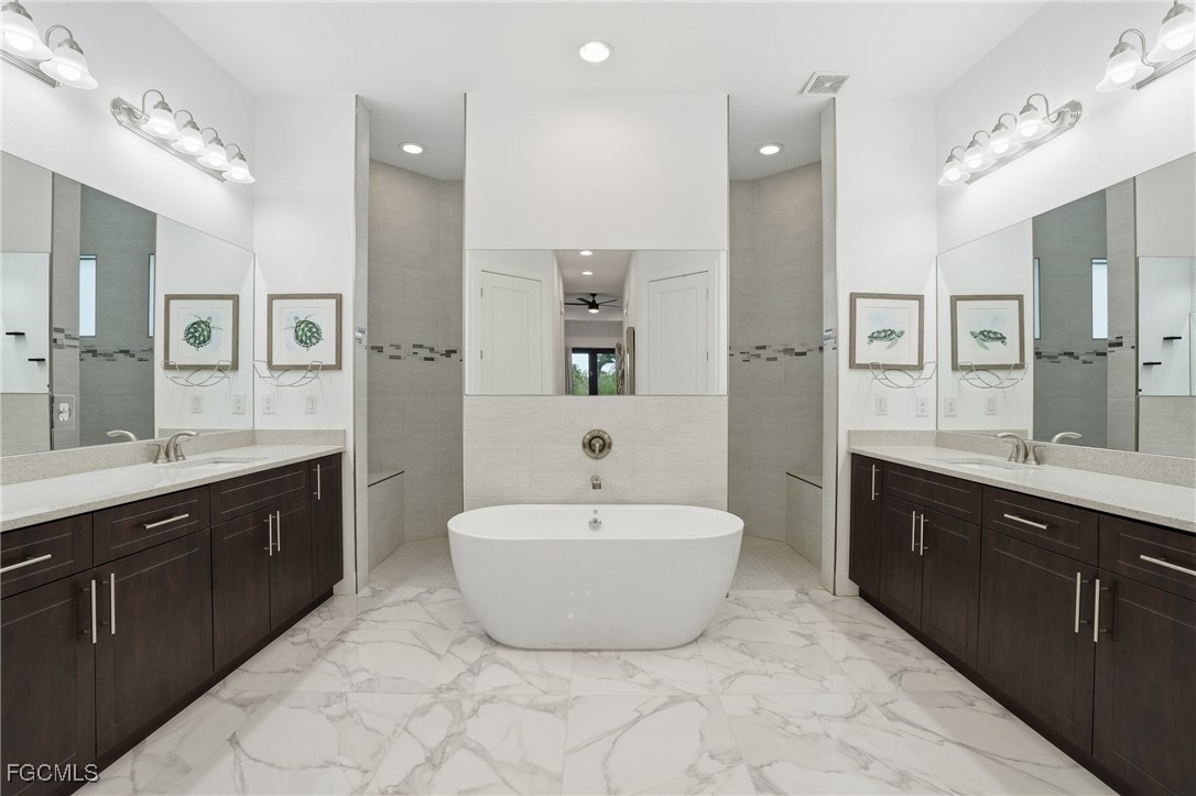 The spacious primary suite includes an en suite bath with separated dual vanities, a soaking tub, and a walk-in shower. Three additional bedrooms offer comfort and privacy for family or guests.