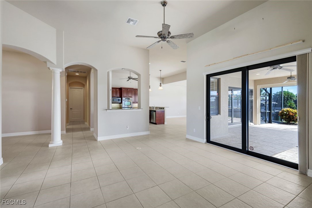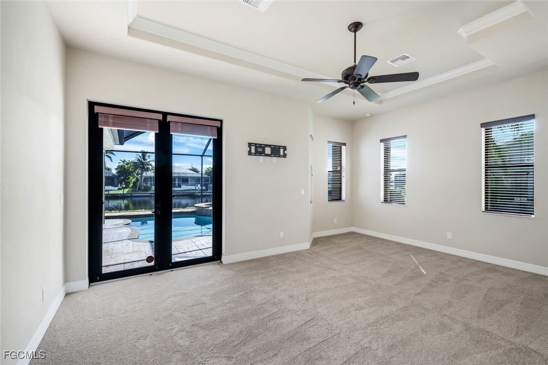 Step through the etched glass double doors and be welcomed by an open, light-filled living space with a wall of sliding glass doors showcasing stunning views of the pool and canal. The 2,800 sq. ft. floor plan includes 4 bedrooms plus a den (or 5th bedroom) and 3 full baths, designed for both comfort and entertaining.