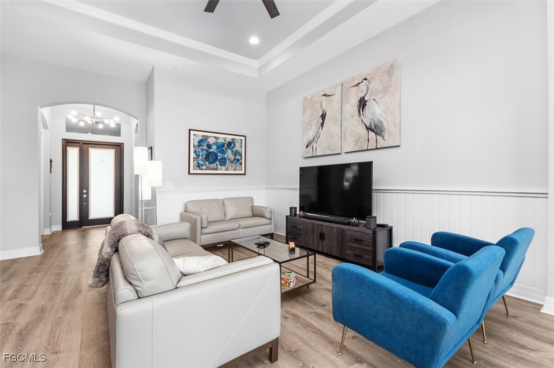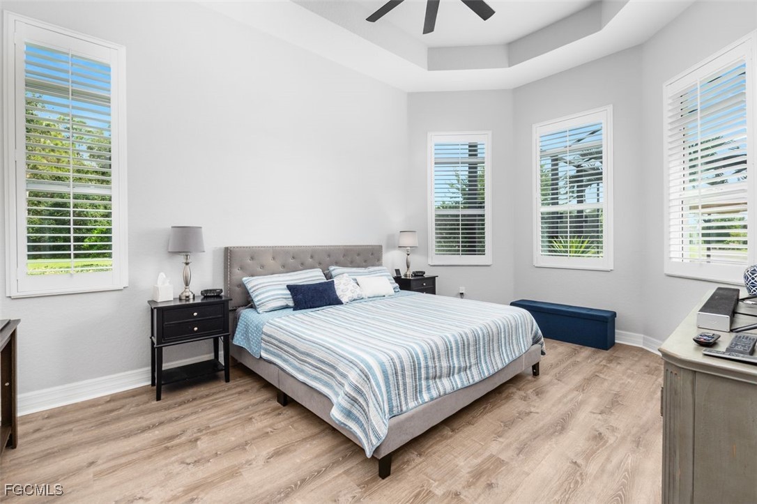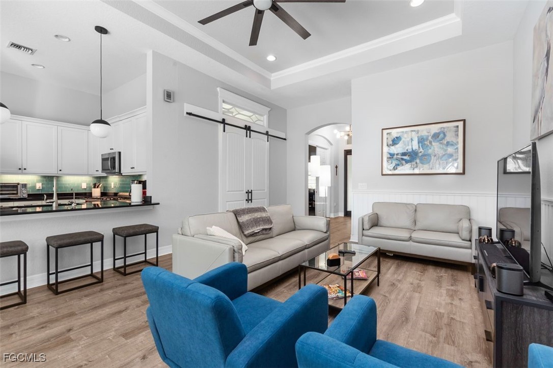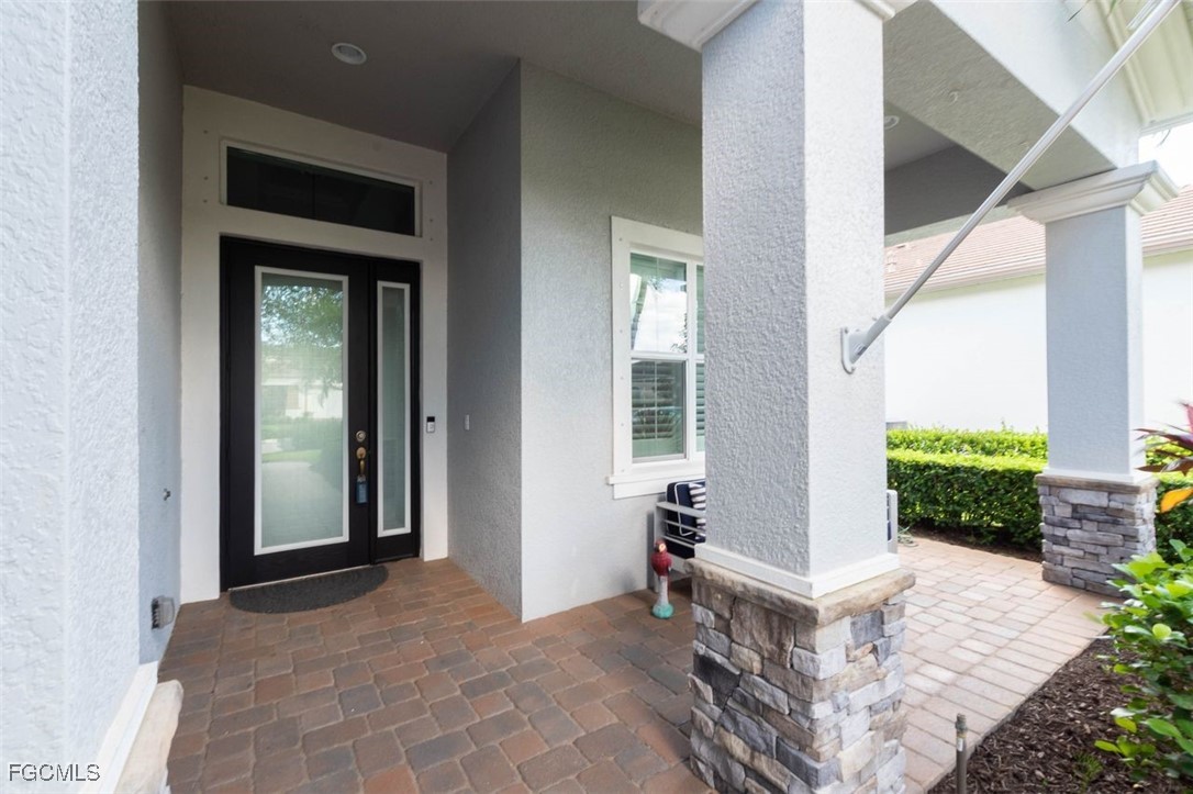 TRULY A REMARKABLE HOME. It's a rare find when you discover a mid range home with million dollar upgrades. This home offers 2 bedrooms, a study/den and a formal dining room which is currently being used as a exercise room. Beautiful and bright, the sliding barn doors close off the exercise room for privacy. PLANTATION SHUTTERS, custom ceiling fans and light fixtures add to the already beautiful interior. ALL the floors throughout (except for the bathrooms, have been replaced with elegant (LVP) WOOD FLOORS. The roomy eat-in kitchen features stainless steel BOSCH APPLIANCES and a HIGH END RANGE by SMEG. The screened in lanai has an oversized heated pool, an OUTDOOR KITCHEN, and ELECTRIC HURRICANE SHUTTERS. The mature landscaping, stately front elevation and views of a fresh water lake are stellar and never gets old. Verandah has created a wonderful lifestyle with two 18-hole championship golf courses, tennis courts, a state-of-the-art fitness center, a community pool, pickleball, and bocce ball courts....there's even a Doggy Park for man's best friend. For those who love outdoor activities, how about venturing out and KAYAKING on the adjacent ORANGE RIVER, or going for a nice bike ride or walk on the 9+ miles of trails? Verandah is conveniently located to Downtown Ft Myers, the Caloosahatchee River, and both the Ft Myers and Punta Gorda Airports.