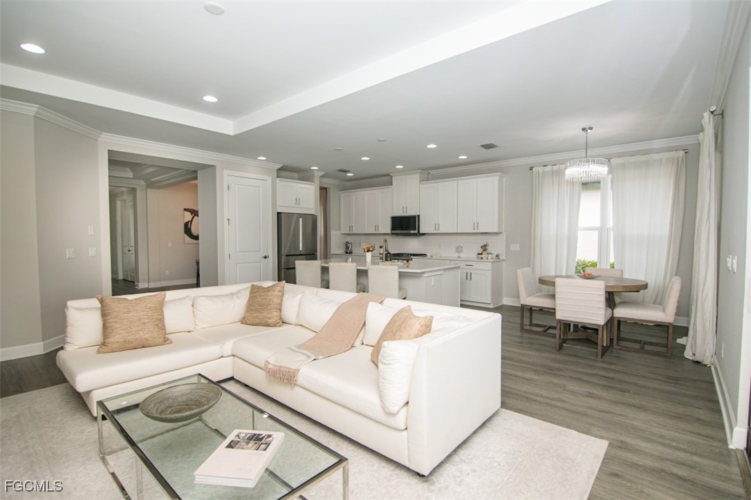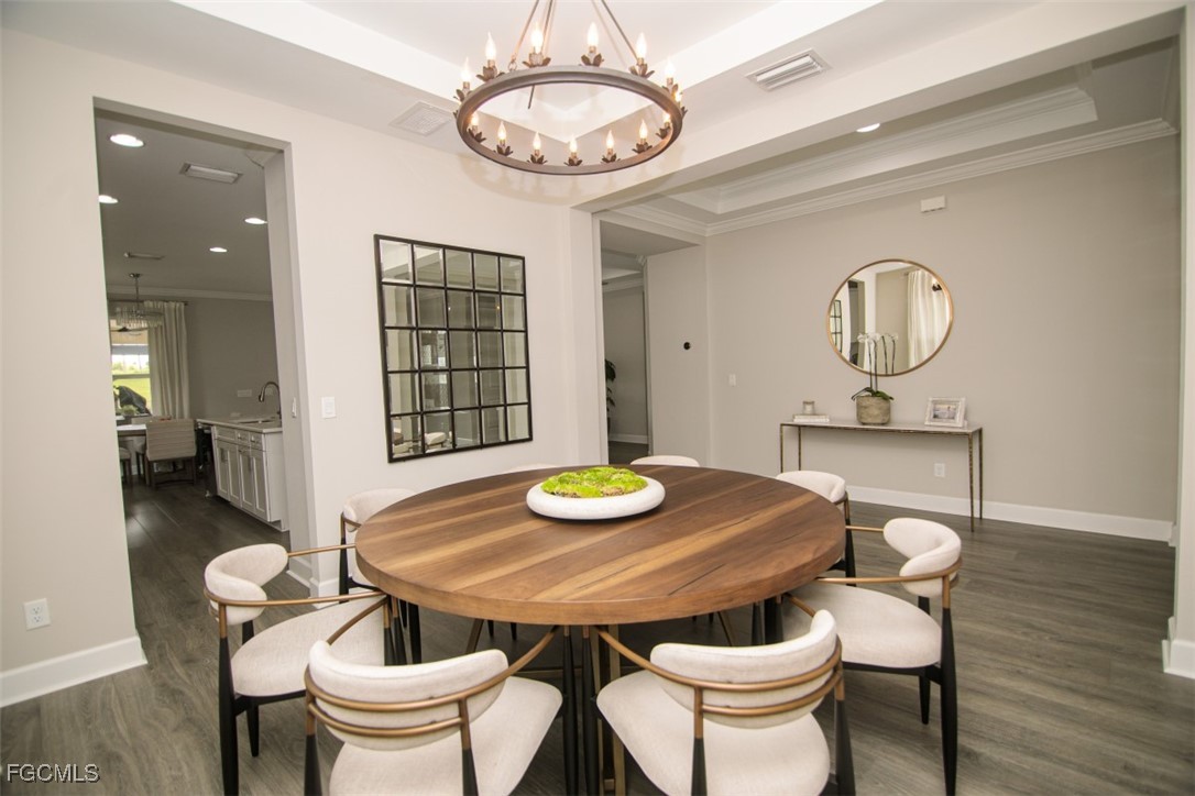 Inside, you'll find elegant crown molding and tray ceilings throughout, adding architectural charm and a touch of sophistication. The thoughtfully designed floor plan includes a formal dining room, ideal for entertaining guests or enjoying special family gatherings.