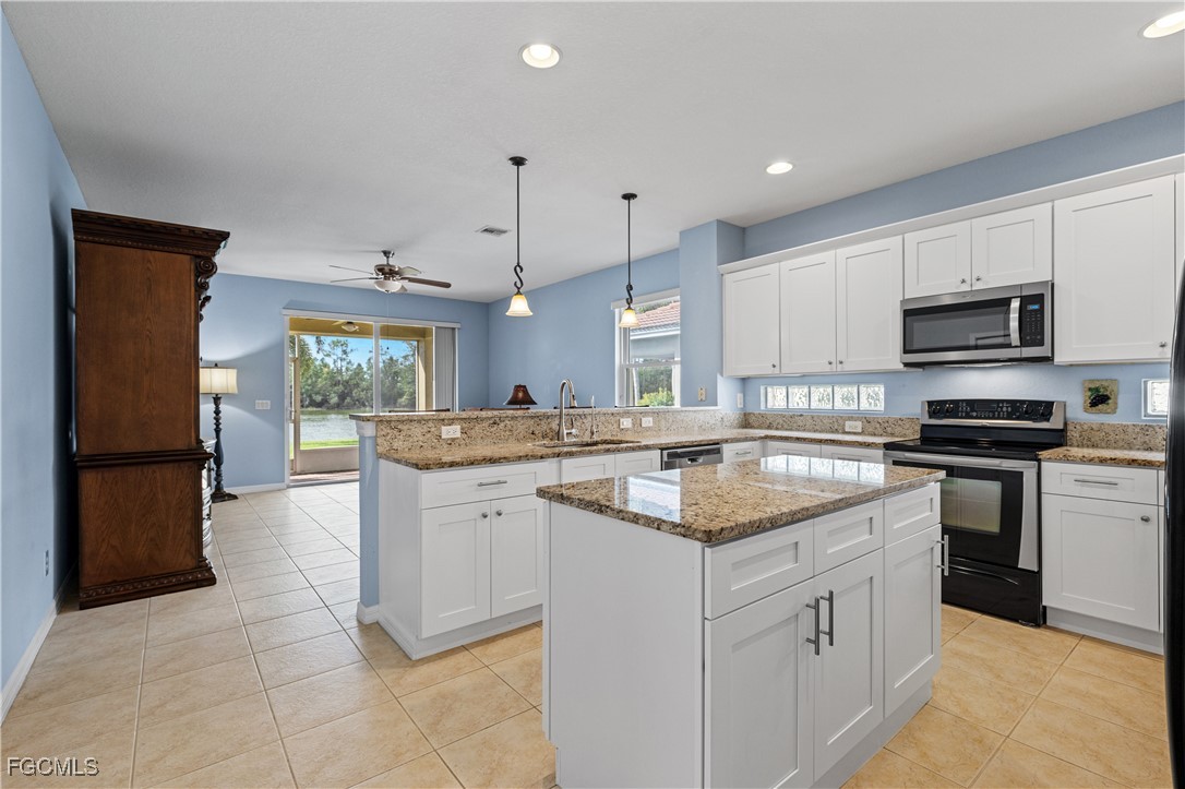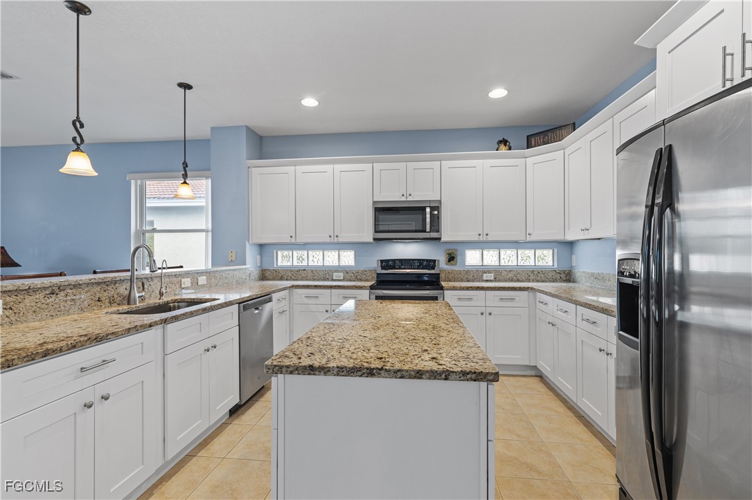 The heart of the home is the spacious kitchen, showcasing white shaker cabinetry, an island with attractive granite countertops, stainless steel appliances, and a convenient pantry—truly the perfect gathering spot for conversations and cooking alike.