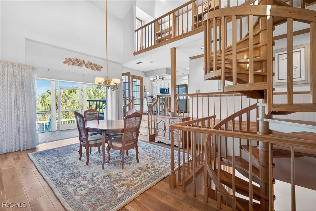 Inside, the main living level is bright and open with vaulted ceilings, warm wood accents, and an easy flow designed for both everyday living and entertaining. Large windows and sliding doors connect the living and dining areas to expansive screened lanais and an additional open deck, creating seamless indoor to outdoor living with peaceful lake and golf course views.