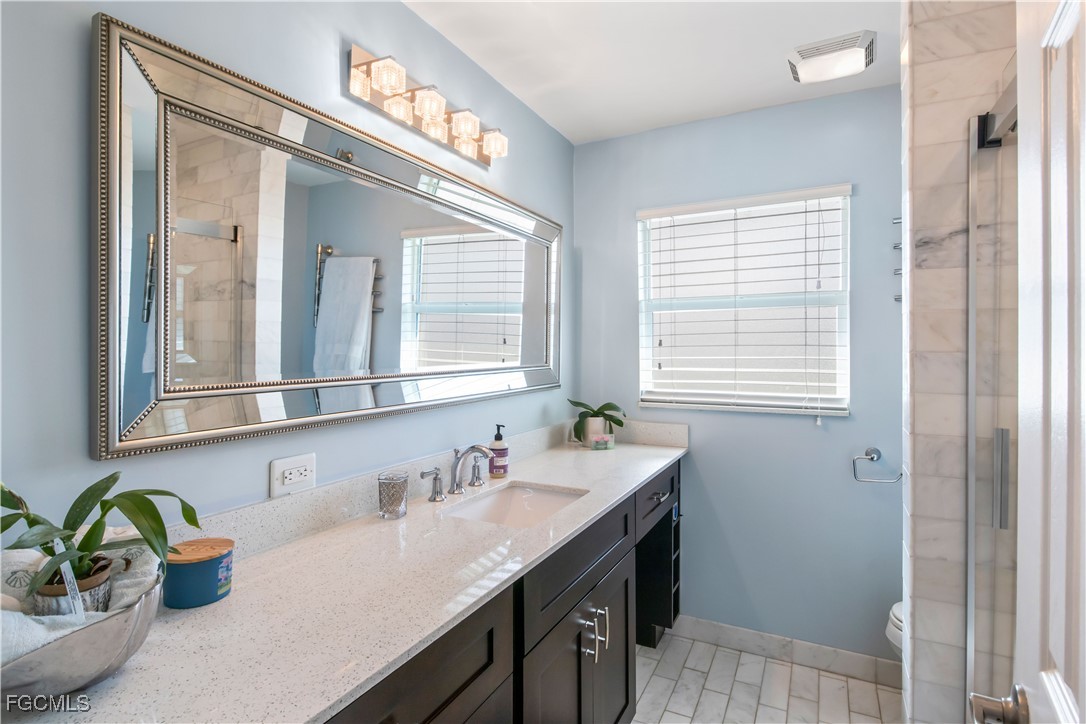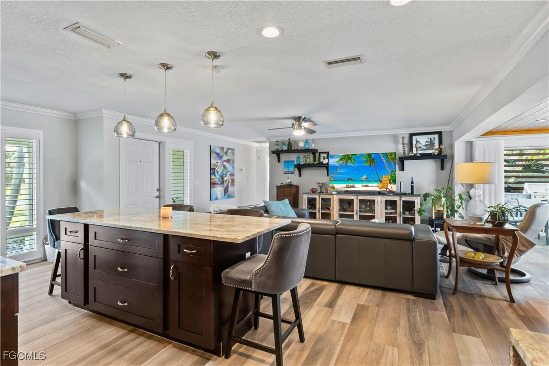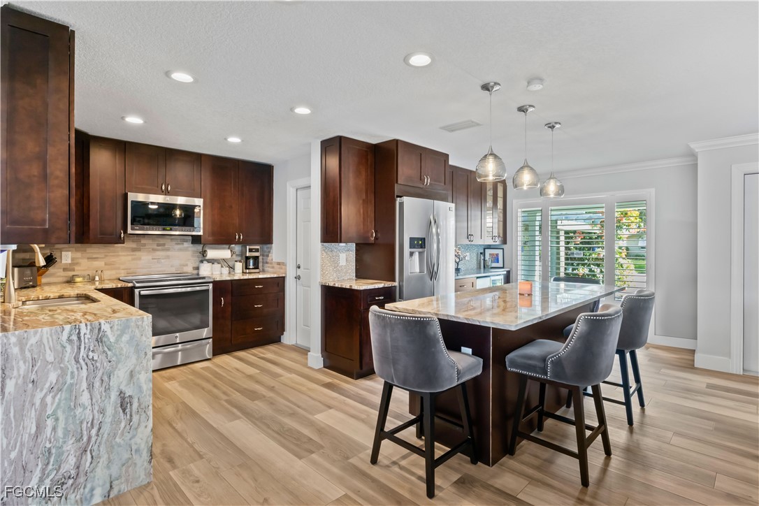 Inside, the home features tile wood-look flooring throughout, upgraded lighting fixtures, and custom molding with architectural detailing. The updated kitchen offers wood cabinetry, granite countertops, stainless-steel appliances, and a built-in wine cooler, flowing seamlessly into the dining area highlighted by a wood-accent ceiling. Experience true Florida outdoor living with a raised screened lanai, a resort-style pool with sun shelf/ledge, and a fully equipped outdoor kitchen with built-in grill. A convenient pass-through to the sunroom enhances seamless indoor-outdoor connectivity. The primary suite provides a private retreat with a spa-inspired bathroom featuring a large walk-in shower, double vanity, and an expansive walk-in closet complete with a separate makeup vanity. One of the guest bedrooms is an ensuite, offering added comfort and privacy, while the third bedroom is ideal for guests or a home office. Additional features include a spacious garage with room for a golf cart, recreational toys, or extra storage, mature tropical landscaping, continuous curbing, and a central location close to bridge access, dining, shopping, and major routes. This exceptional waterfront home offers the perfect blend of location, upgrades, and an unmatched boating lifestyle.