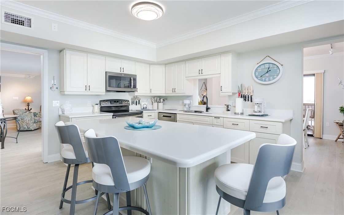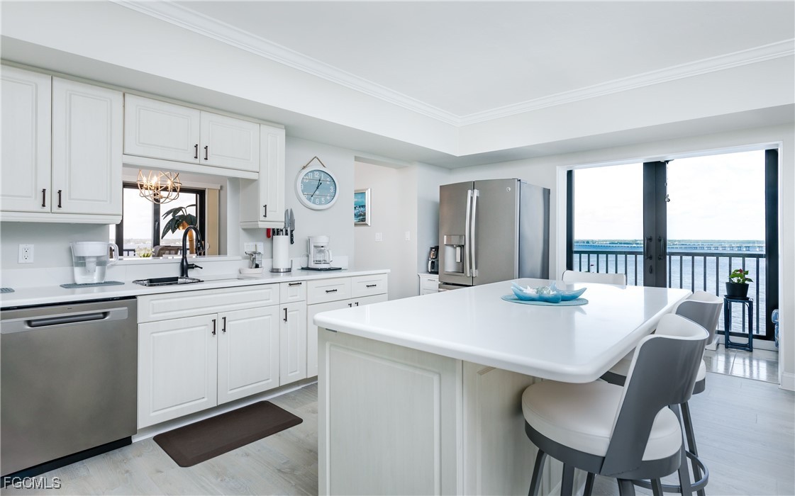 Incredible views from this 9th floor end unit condo overlooking the Caloosahatchee River, sunrise and sunset! Located in the River District, you are walking distance to downtown events, fine dining, shops and entertainment. This 2,025 sf home has wrap around lanais accessible by all rooms in the condo. Natural light floods into the home from every room. As you step onto the lanai you can feel the breezes from the Gulf and see amazing wildlife and beautiful yachts. Home has had many beautiful renovations including a large kitchen with island, wine fridge, built in counter tops and new dishwasher, and flooring that opens up into a family room, perfect for entertaining. The great room has a beautiful fireplace with stunning views of the river. The expansive primary bathroom with double sinks, separate soaking tub and shower has a spa like feeling. Pointe Royale offers many amenities including a sparking pool overlooking the river, state of the art exercise room and community center, tennis and pickaball courts and extra storage. This unit has dedicated parking on the first floor of the garage. Sliding storm protection doors covering all lanai areas.