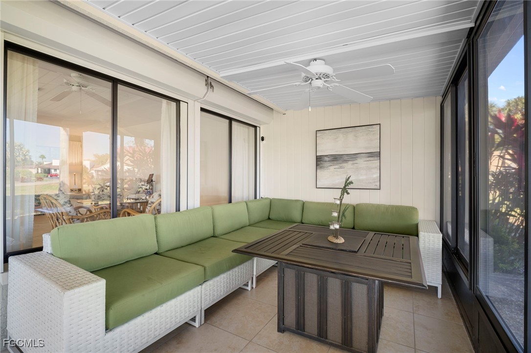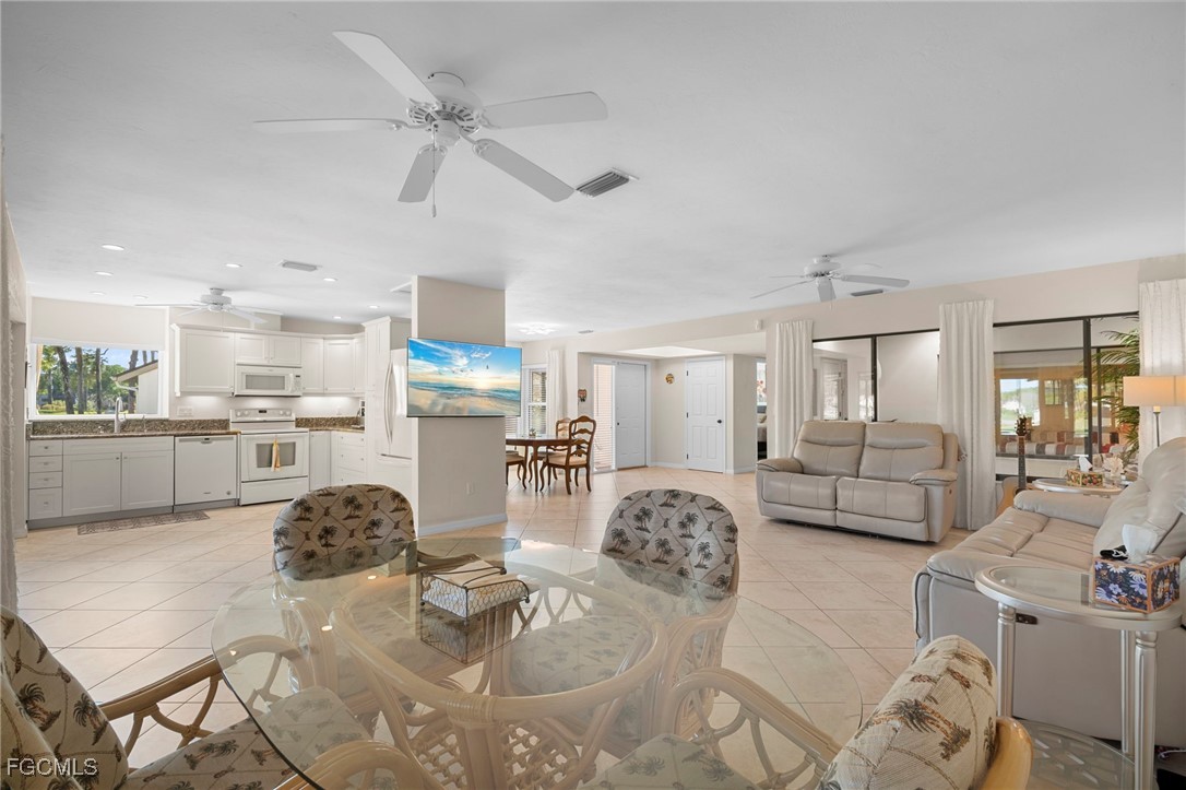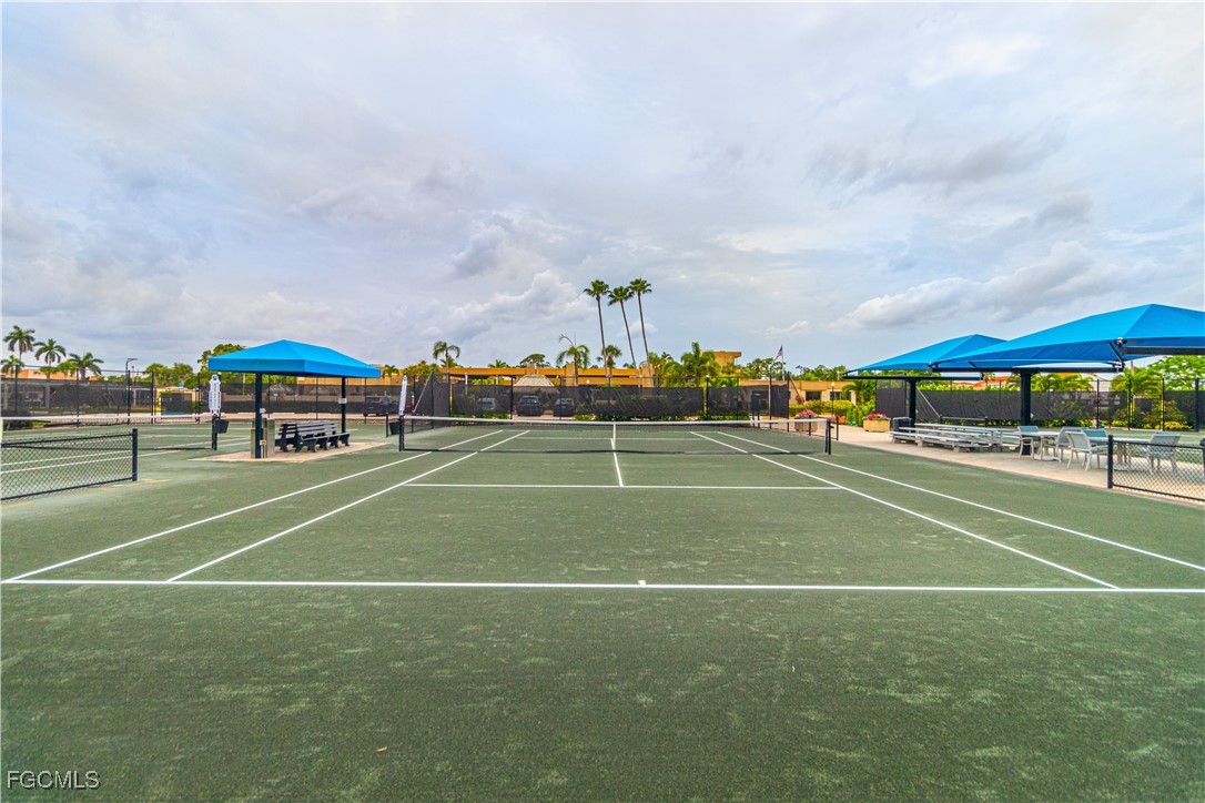 Welcome to this Fully Furnished/Turnkey Biscayne Garden Villa floor plan over 1600 sq feet of living space the biggest floor plan in Seven Lakes and has gorgeous panoramic views of the 10th golf hole and the signature lake with its beautiful fountain! East-West rear exposure with natural light all day. Enjoy the winter breezes while you sit and relax on your large screened in lanai, furnished with a firepit that adds to your evening's enjoyment. Magnificent view right in front of the lake which captures the lighted water feature too. Three bedrooms and a den this floor plan offers lots of open living space for entertaining. Updated with tile flooring throughout the condo. Kitchen has shaker cabinetry with plenty of storage, a water filtering system too. Both Bathrooms have remodeled tile walk-in Showers and vanities. Impact Resistant windows (2025) and Hurricane shutters offer added protection. New roof 2024, Hot Water Heater 2023. The garage has a full-size washer and dryer, laundry tub, work bench, new tiled flooring and a screened door for your comfort. GOLF CART SPACE # 416 INCLUDED!! A Golf Cart with lithium batteries is negotiable. Quiet street yet walking distance to Tee Room (On-Site Restaurant) and TEE Off. Seven Lakes is an active adult Community!! 24 Hour Guard Gated entry. Condo fees cover your internet, cable, water, sewer, trash removal and lawn maintenance. As an owner you pay your monthly electric service. As for the outdoor activities; Executive 18-hole golf course, 6 Har-Tru Tennis Courts, Basketball, Pickle Ball Courts, Bocce, 6 Heated Pools, Shuffleboard; then for your indoor activities include Crafts, Pottery, Lapidary, Cards, hobby rooms, library, woodshop and so much more. Truly a lifestyle with an abundance of activities in your back yard. Come Visit Us and take a look at this must-see GARDEN VILLA!!