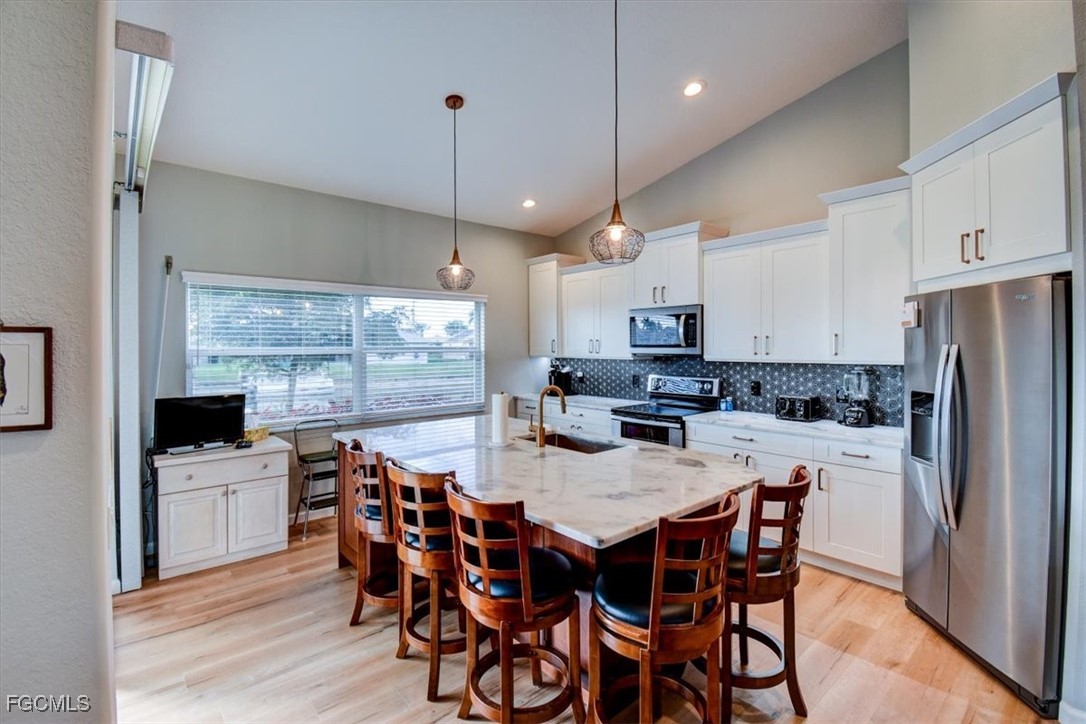 Welcome to your slice of Southwest Florida paradise. Perfectly positioned just off Pelican Boulevard in one of Cape Coral’s most desirable locations, this stunning 3-bedroom, 2-bath waterfront home sits on an oversized lot and offers the ultimate blend of luxury, comfort, and Florida lifestyle. At the heart of the home is a beautifully updated kitchen, thoughtfully designed for both everyday living and entertaining, featuring modern finishes and a seamless flow into the main living areas. Step outside to the expansive, oversized lanai—your private oasis showcasing sweeping views of Mohave Lake along with tranquil canal vistas, as the Courtney Canal intersects the lake and connects to an extensive canal system. This rare combination of lake and canal views creates an extraordinary setting for morning sunrises, afternoon relaxation, and unforgettable sunsets that fill the sky with breathtaking Southwest Florida colors. Whether entertaining guests or enjoying quiet evenings, this outdoor living space truly captures the essence of the Florida waterfront lifestyle. The primary suite is a serene retreat, complete with an updated master bathroom offering refined finishes and a spa-like ambiance. Located in the heart of Cape Coral, just minutes from downtown, you’ll enjoy easy access to premier dining, shopping, and some of the area’s most vibrant nightlife—all while returning home to a peaceful, waterfront sanctuary. Boating, wide water views, palm-lined streets, and year-round sunshine define this exceptional Southwest Florida lifestyle. This is more than a home—it’s a destination. Schedule your private showing today and experience the best of lakefront and canal living in Cape Coral.