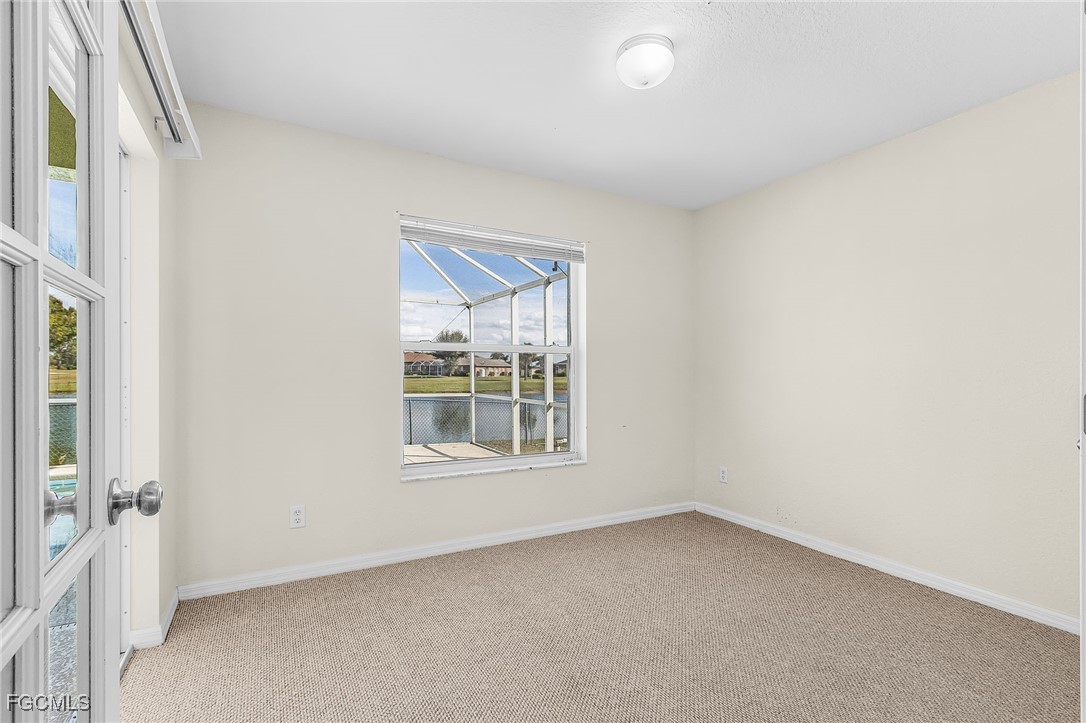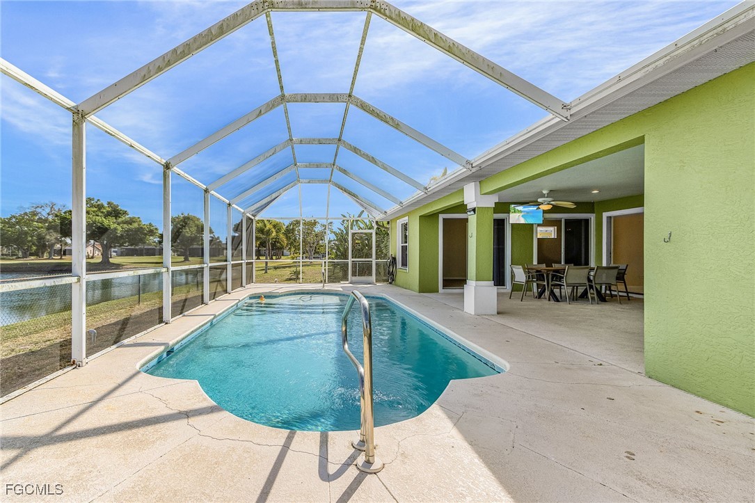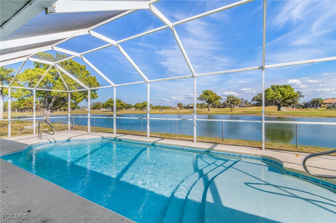 This stunning 4-bedroom, 2.5-bath waterfront pool home is perfectly situated in NW Cape Coral on the Coral Oaks Golf Course, a par-72 course offering serene lake and fairway views. Enter through elegant French doors into a bright and airy great room with soaring cathedral ceilings and sightlines that lead straight to the screened-in pool and lanai, showcasing picturesque lake and golf course views. The home features numerous recent updates, including modern tile flooring throughout the main living areas and bathrooms (2026), fresh exterior paint (2025), a new roof (2023), a new air handler and AC compressor (2024), and brand-new appliances—dishwasher, washer, and dryer (2024). The spacious primary suite includes an attached den/office, a large walk-in closet, and a luxurious bath with dual vanities, a jacuzzi tub, and a walk-in tile shower. Wall-mounted TVs in every room are included, adding exceptional value. Designed for indoor-outdoor living, the home offers three sliding glass doors and an additional door leading to the pool lanai—an especially desirable feature. Located in a quiet, safe neighborhood with excellent schools and nearby parks, this home provides both peace and convenience, with easy access to shopping, dining, and recreation. Just minutes from Burnt Store Boat Ramp, the Seven Islands Project, Crystal Lake Park, and more, this property truly offers the best of the coastal Florida lifestyle.