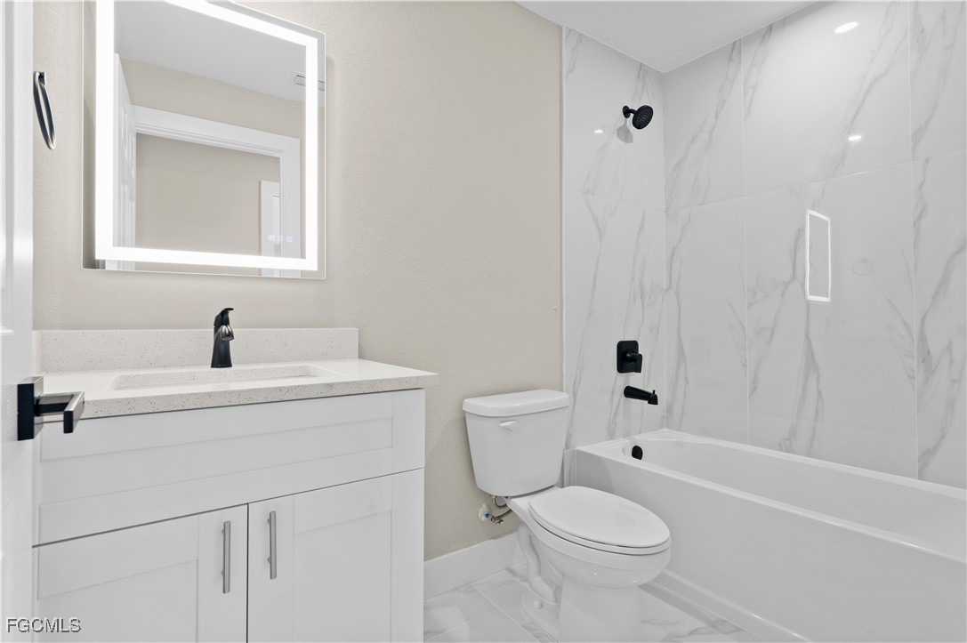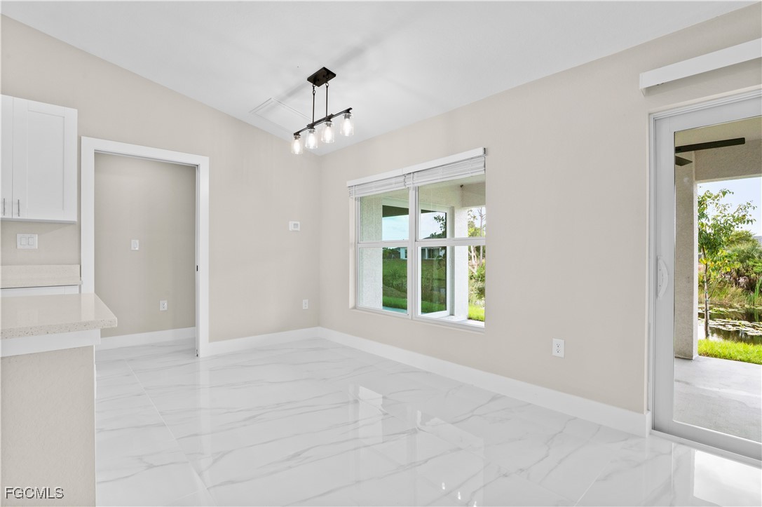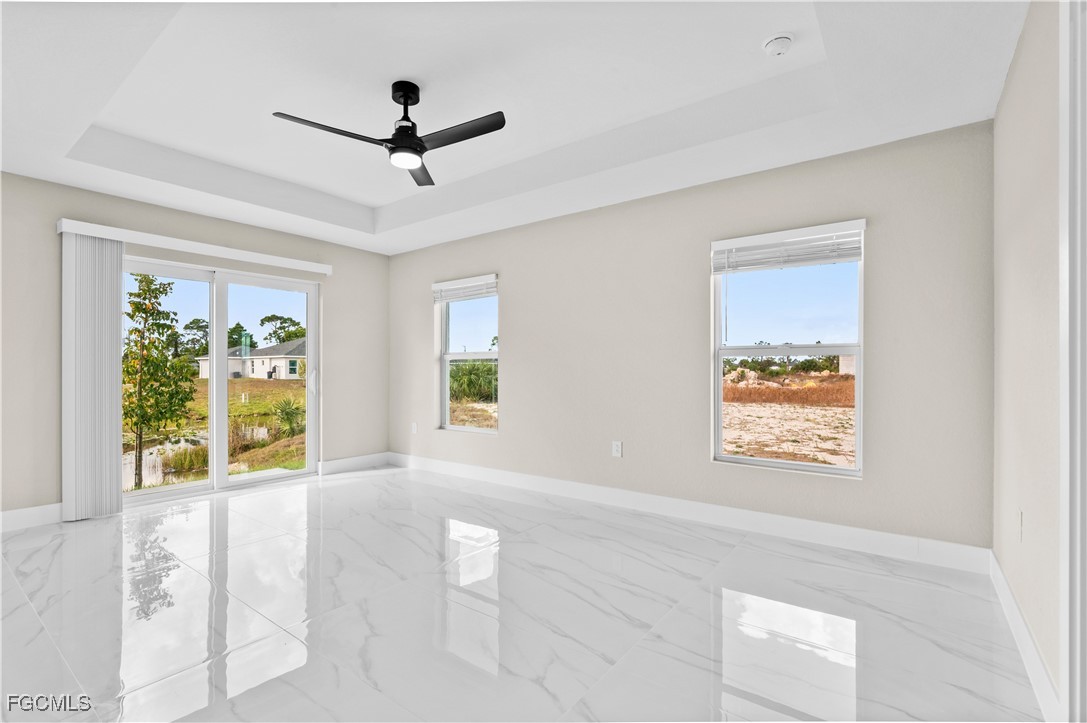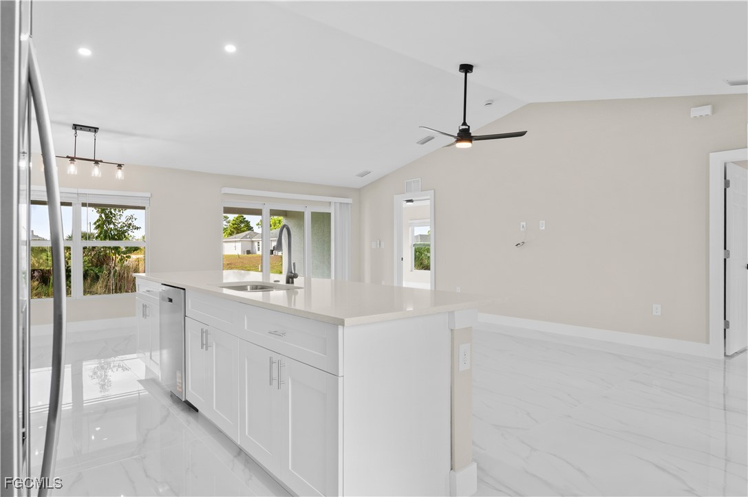This new construction home offers four bedrooms and three full bathrooms with plenty of space for guests or a home office. Situated on a freshwater canal, the property provides a peaceful setting while remaining conveniently close to grocery stores, dining, and everyday essentials. The kitchen is designed for both function and style, featuring quartz countertops, a large center island, white shaker cabinetry, and stainless steel appliances. Matching tile flooring runs throughout the home for a clean, cohesive look and easy maintenance. Impact-resistant windows and doors provide added security and peace of mind. Ideally located just a short drive to US-41, Pine Island Road, and Del Prado Boulevard, this home combines modern construction, canal-front living, and convenient access to shopping and major roadways. Not in a flood zone.