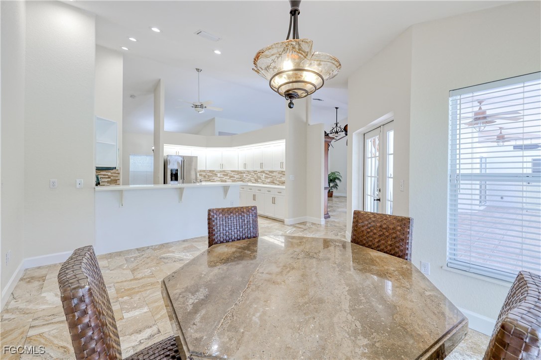 The kitchen is equipped with stainless steel appliances, solid-surface countertops, pantry storage, and a decorative backsplash. The primary suite includes a spa-style bath with two-person rainfall shower, jetted soaking tub, dual-sink vanity, and modern finishes. A half bath on the lanai provides added convenience for outdoor entertaining.