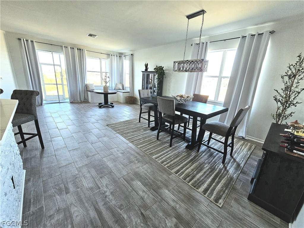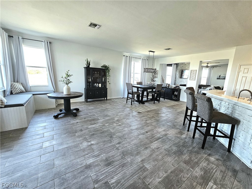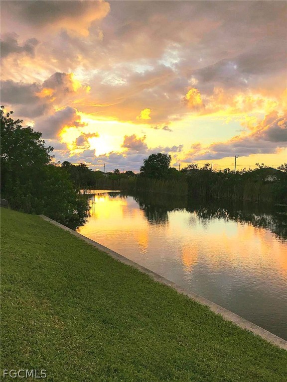 This beautifully remodeled 3 bedroom + den waterfront home offers a spacious open concept layout designed for modern living and effortless entertaining. Thoughtfully positioned with north-south exposure, the home is filled with natural light from expansive windows throughout, creating a bright and airy atmosphere while showcasing stunning sunset views from the backyard. Inside, you’ll find plank tile flooring throughout, a built-in stone fireplace, and a stylish coffee bar with beverage fridge. The primary suite is a true retreat, featuring a spa like rainfall shower. Major upgrades include a high efficiency 21 SEER AC system, whole home reverse osmosis water system, and new Tamko Titan-XT roof in 2023. Ideally located just minutes from dining, shopping, Pine Island Road, and Burnt Store Road. This home is also not in a flood zone.