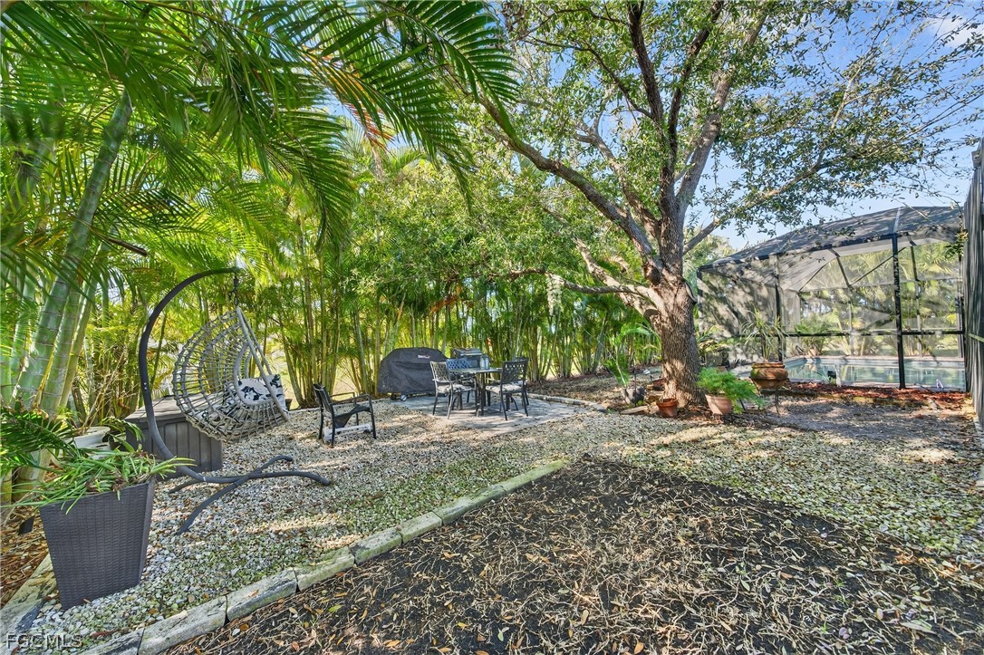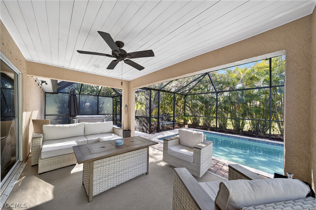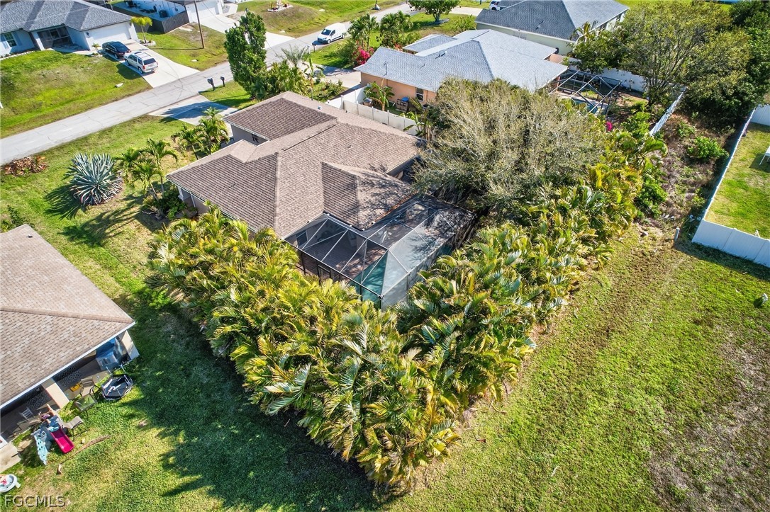 This private Florida retreat is built around outdoor living. The southern exposure keeps the pool sun-drenched, bright, and inviting — ideal for long afternoons in the sparkling saltwater pool or unwinding in the hot tub under the covered lanai. The newly enlarged lanai creates an expansive outdoor living space designed for entertaining, relaxing, and truly enjoying the Southwest Florida lifestyle. Triple pocket sliding glass doors open the home completely to the outdoors, blending indoor and outdoor living into one seamless space. The wood-accented ceiling adds warmth and character, making the entire area feel custom and elevated. Mature, lush landscaping —surrounds the backyard and enhances privacy. Inside, the home has been extensively updated with meaningful renovations. The kitchen features granite countertops, a stone-accented bar, stylish backsplash, and a spacious pantry. The primary suite has a shiplap accent wall, a new glass-enclosed shower, and a custom wood-shelved walk-in closet. Major improvements: new roof (2023), newer gutters, impact windows, new AC system installed in 2025 with an infrared ionizer, and a mini-split AC in the garage. Additional upgrades include landscape lighting, a second pantry in the laundry room, and pull-down attic storage. Convenient to the Burnt Store boat launch and Coral Oaks golf course.