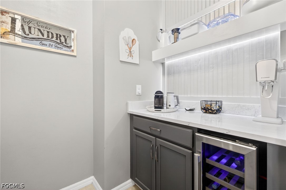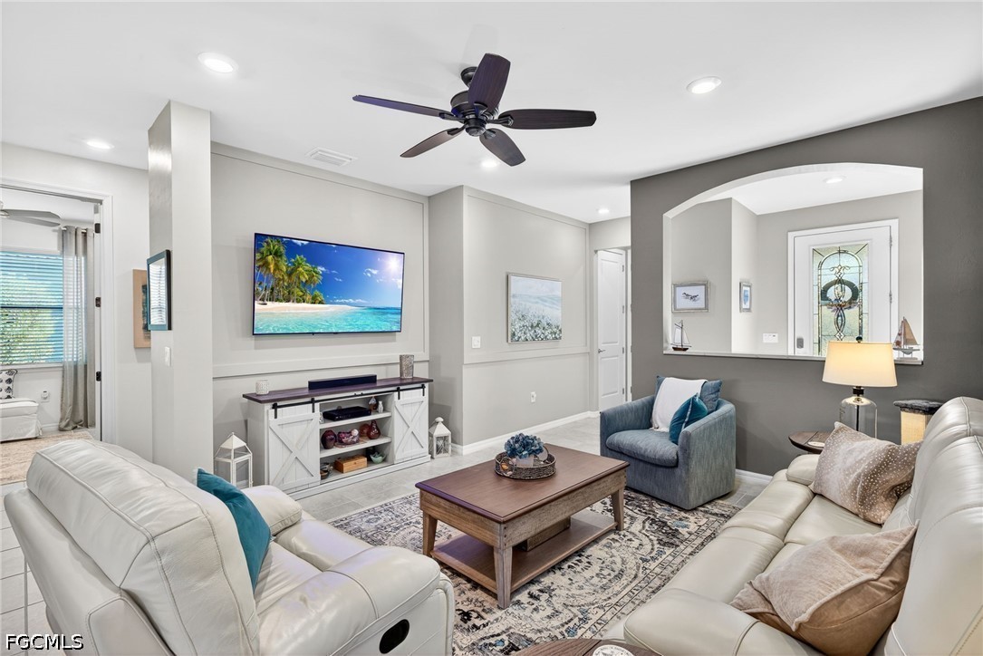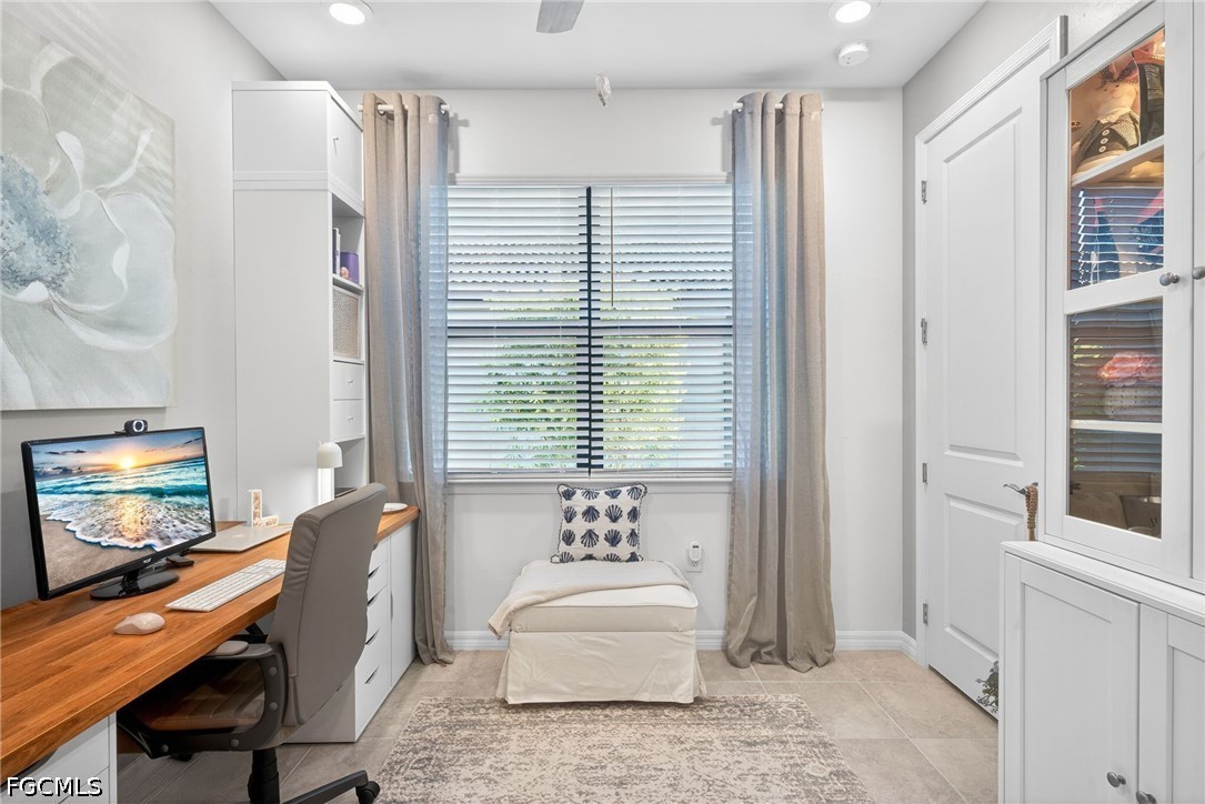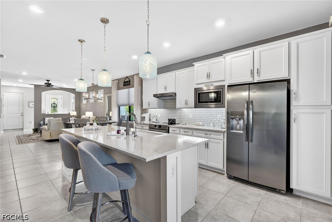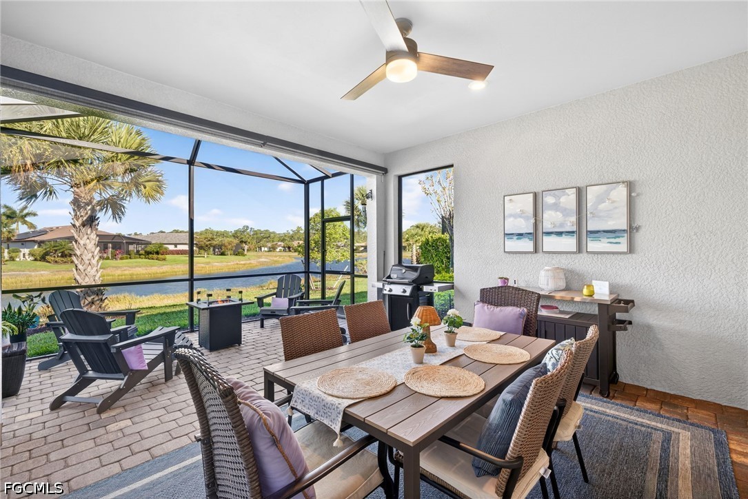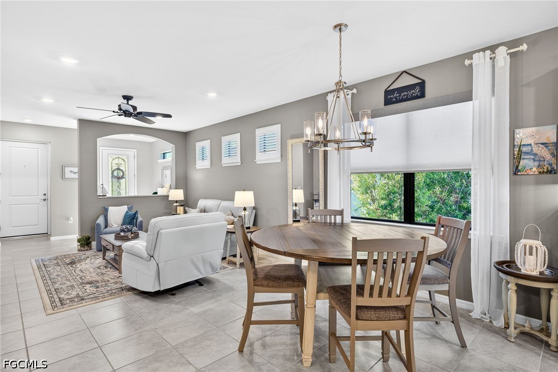 Full of charm and thoughtful upgrades, this 3 Bedroom, 2 Bathroom home stands out with its stylish finishes and attention to detail. The glass entry door offers a welcoming first impression and hints at the custom touches found throughout. Inside, the living spaces are enhanced with eye-catching wall treatments and recessed lighting that add both warmth and dimension. The kitchen delivers a unique blend of function and flair, featuring a wallpaper accent wall, quartz countertops, tile backsplash, new refrigerator, induction range, lower cabinet pull-outs, and an impressive wall of buffet cabinetry—ideal for entertaining and everyday convenience. Tile flooring in both the primary and second bedrooms adds a clean, cohesive look, while the second bedroom includes built-ins that can remain, offering added versatility. Eight-foot doors throughout elevate the overall sense of space. The laundry room is anything but ordinary, finished with beadboard detail, extra cabinetry for added storage, and a built-in beverage center. Additional highlights include a whole-house water filtration system and overhead garage storage for practical ease. Outside enjoy stunning sunsets on the extended covered lanai providing a comfortable retreat with tranquil lake views—perfect for relaxing or hosting guests. Located in Bridgetown, residents enjoy an exceptional amenity-rich lifestyle with a resort-style pool, lap pool, fitness center, tennis, pickleball, and a wide variety of organized activities and events designed to bring neighbors together. A home with distinctive character and meaningful upgrades, ready to be enjoyed from day one. Make an appointment today to see it!